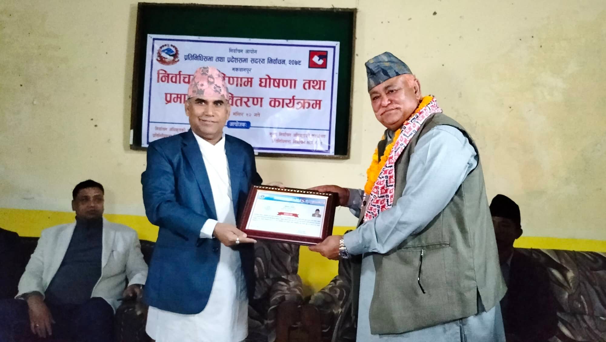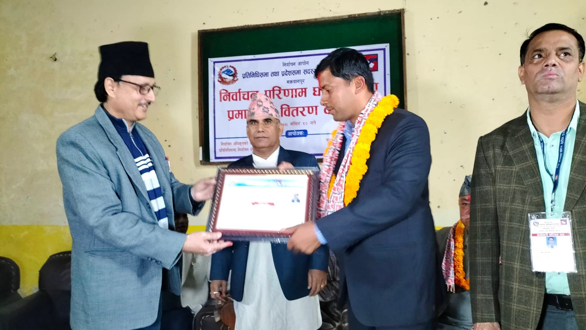मकवानपुरको निर्वाचन अधिकृतको कार्यालयले जिल्लाको प्रतिनिधीसभा क्षेत्र नम्बर–१ मा बिजयी राप्रपाका नेता दिपक बहादुर सिंह, मकवानपुर क्षेत्र नम्बर–२ मा विजयी नेकपा एमालेका बागमती प्रदेशसका उपसचिब महेश कुमार बर्तौलालाई विजयी भएको आधिकारीक घोषणा गर्दै आजै प्रमाणपत्र वितरण गरेको हो ।