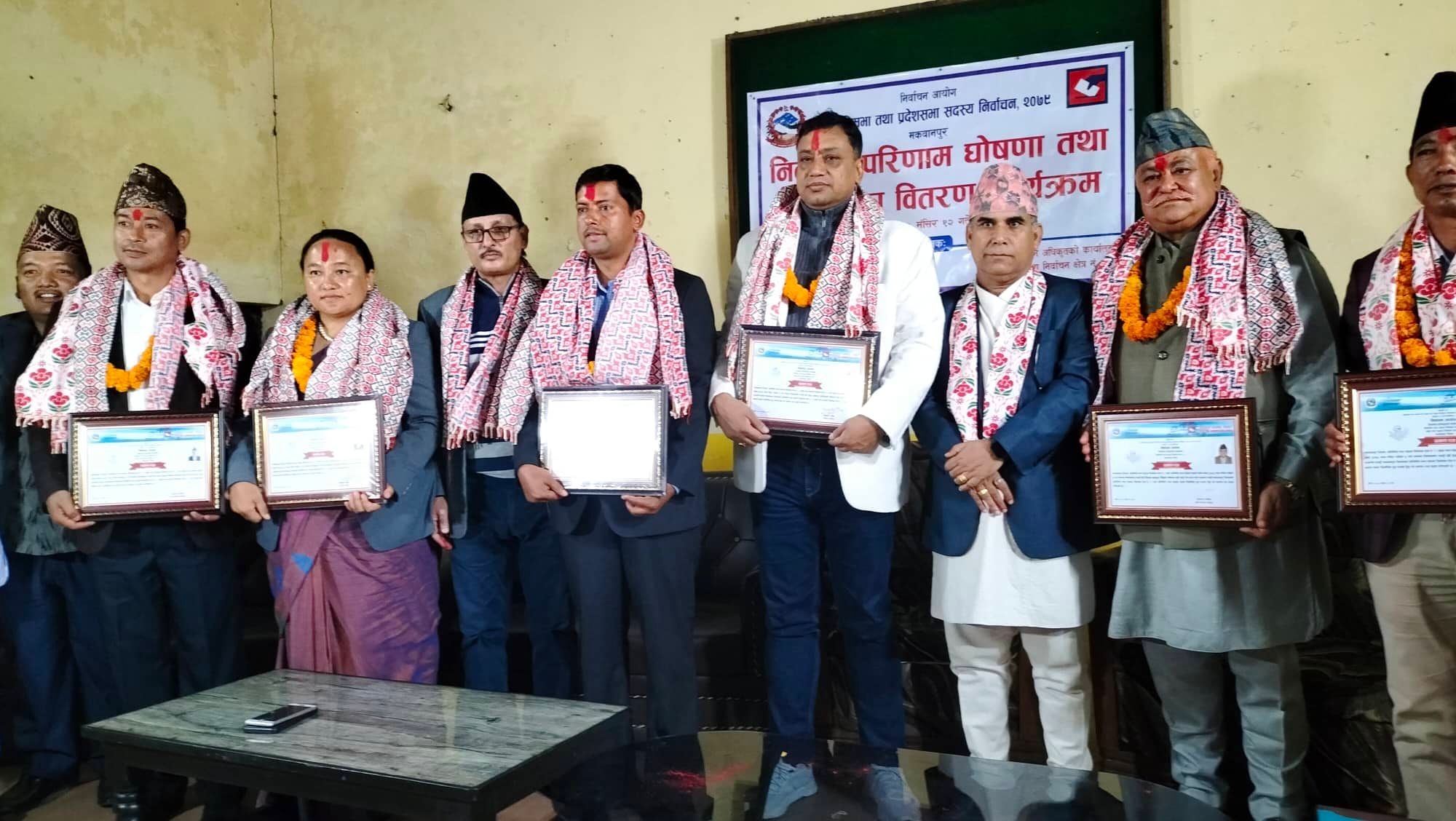 त्यसैगरी क्षेत्र नम्बर–१ को प्रदेशसभा (१) मा विजयी माओबादी केन्द्रका नेता प्रेम बहादुर पुलामी, क्षेत्र नम्बर १ को (२) मा निर्वाचित एमालेका मकवानपुर अध्यक्ष एकालाल श्रेष्ठ, क्षेत्र नम्बर–२ को प्रदेशसभा (१) मा निर्वाचित माओबादीका नेता कुमारी मोक्तान, क्षेत्र नम्बर–२ को (२) मा निार्वाचित कांगे्रस नेता इन्द्र बहादुर बानिायाँलाई प्रमाणपत्र वितरण गरिएको हो ।