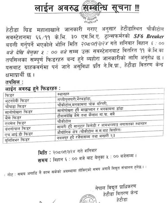आज बिहानैबाट बेलुका ५ बजे सम्म विद्युत अबरुद्ध हुने नेपाल विद्युत प्राधिकरण हेटौंडा वितरण केन्द्रका सूचना अधिकारी रामबाबु लोप्चनले जनाकारी दिनुभयो ।