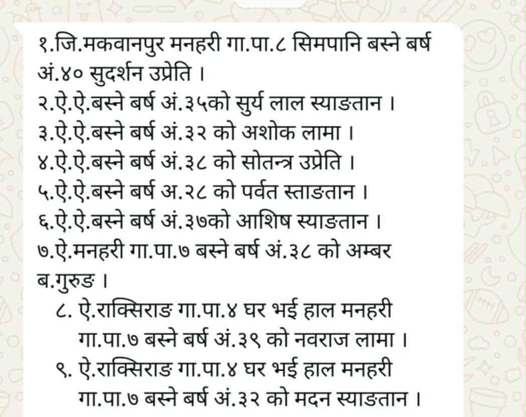 जिल्ला प्रहरी कार्यालय मकवानपुरले उपलब्ध गराएको नाम ठेगाना अनुसार जुवा खेल्दै गरेको र प्रहरीले बयान लिएकाहरु निम्न ब्यक्तिहरु रहेका छन् ।