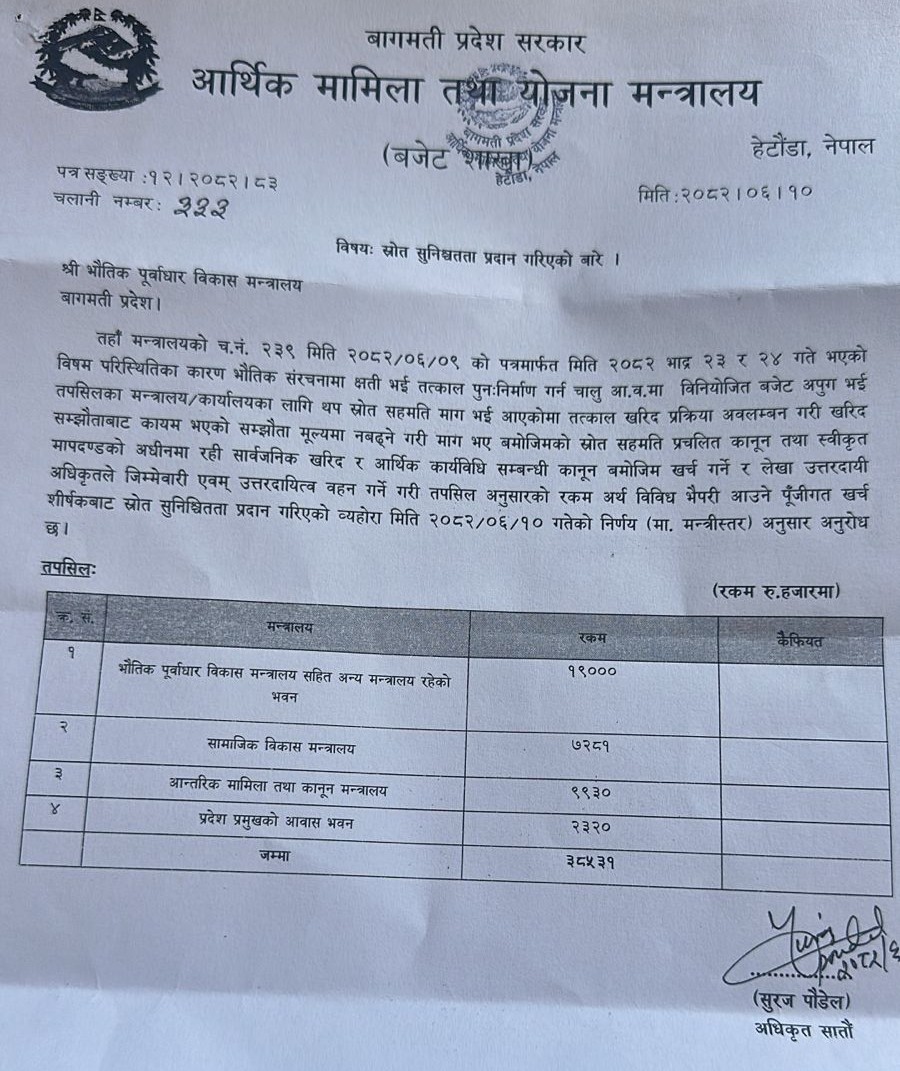 भौतिक पूर्वाधार विकास मन्त्रालय सहित अन्य मन्त्रालय रहेको भवनका लागि एक करोड ९० लाख, सामाजिक विकास मन्त्रालय भवन मर्मत गर्न ७२ लाख ८१ हजारआन्तरिक मामिला तथा कानून मन्त्रालय भवन मर्मत गर्न ९ लाख ९३ हजार र प्रदेश प्रमुखको आवास भवन मर्मत गर्नका लागि २३ बिस हजार रुपैयाँको श्रोत सुनिश्चितता गरिएको हो । गत भदौ २३ र २४ गतेको जेन–जी आन्दोलनका क्रममा बागमती प्रदेशको राजधानी हेटौंडास्थित विभिन्न सरकारी कार्यालयहरूमा ठूलो क्षति पुगेको थियो। प्रदेशसभा भवनदेखि सामाजिक विकास, आन्तरिक मामिला, कानुन तथा भौतिक पूर्वाधार मन्त्रालयका भवनहरूमा आगजनी र तोडफोड भएका थिए।