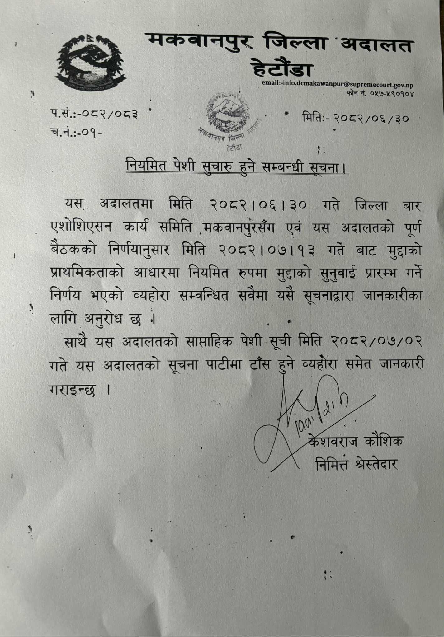 अदालतले शुक्रबार जारी गरेको सूचनामा भनिएको छ, “मिति २०८२–०६–३० गते जिल्ला बार एसोसिएसन कार्य समिति मकवानपुरसँग एवं यस अदालतको पूर्ण बैठकको निर्णयानुसार मिति २०८२–०७–१३ गतेबाट मुद्दाको प्राथमिकताको आधारमा नियमित रुपमा मुद्दाको सुनुवाइ प्रारम्भ गर्ने निर्णय भएको व्यहोरा सम्बन्धित सबैमा जानकारीका लागि अनुरोध छ।” त्यस्तै अदालतको साप्ताहिक पेशी सूची कार्तिक २ गते अदालतको सूचना पाटीमा टाँस गरिने पनि सूचनामा उल्लेख गरिएको कौशिकले जानकारी दिए ।