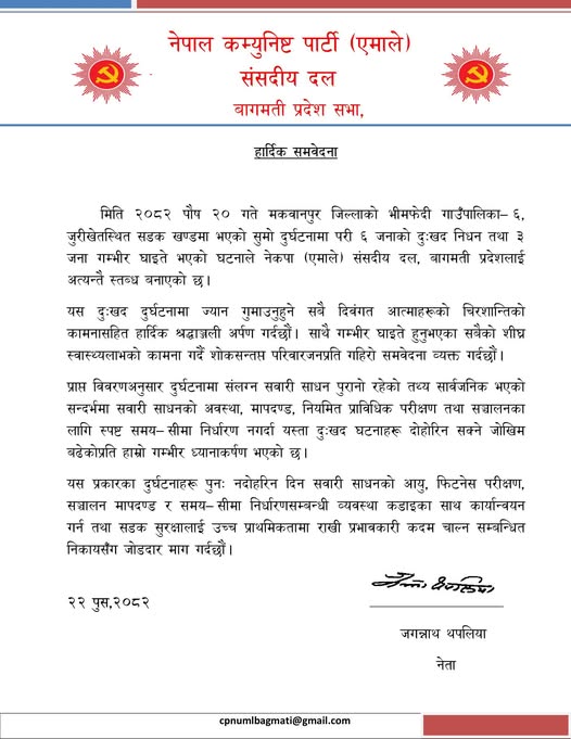 भीमफेदी सुमो दुर्घटनाप्रति एमाले संसदीय दल बागमतीको दुःख व्यक्त