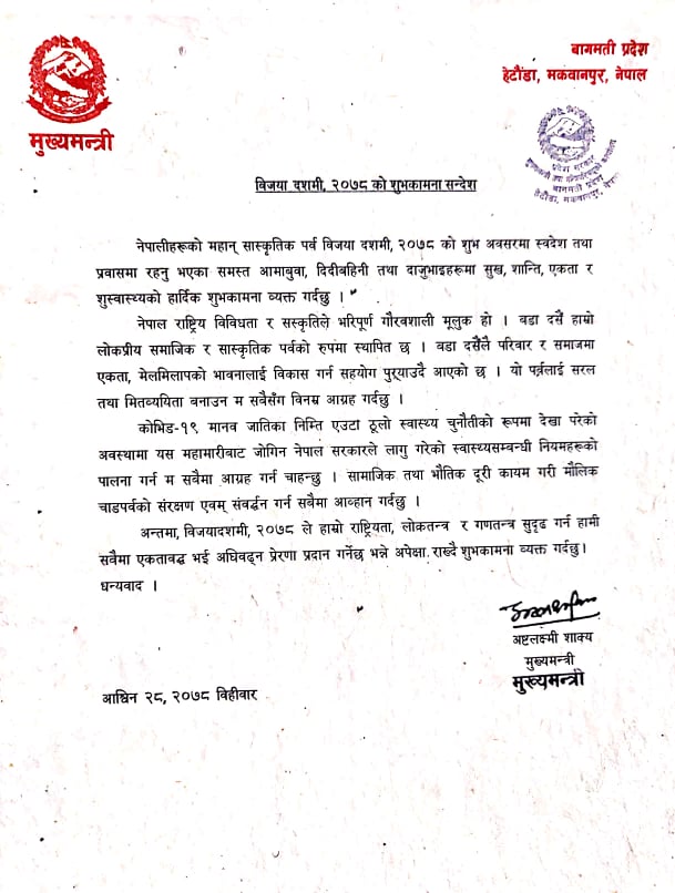 बागमतीका मुख्यमन्त्री शाक्यद्वारा बिजया दशैको शुभकामना