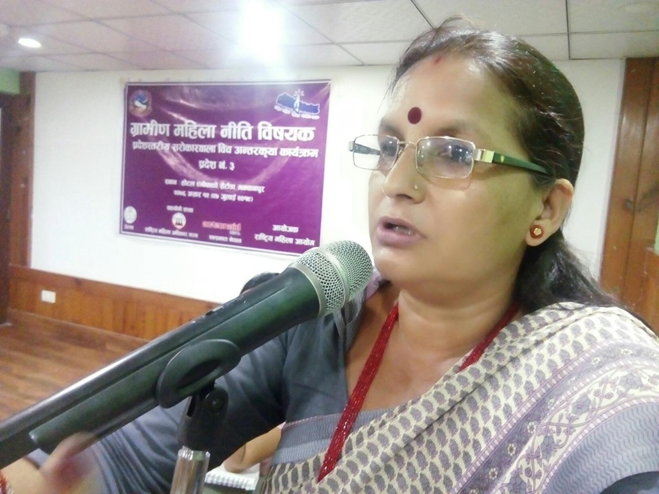 कार्यक्रममा राष्ट्रिय महिला आयोग उपसचिव मिरा शेरचनले ग्रामीण महिला नीति को मस्यौदा प्रस्तुत गरेकी थिईन । कार्यक्रममा नीति तथ योजना आयोग प्रदेश ३ का शाखा अधिकृत सुरेन्द्र भट्टराईले महिलाको अवस्था सुधारकोलागि महिलालाई प्रौढ शिक्षा, ब्यवसायिक सीप, स्वास्थ, बिक्तिय शिक्षा, सामाजिक शिक्षा जस्ता पाटोलाई नीतिगत रुपमै समेटेर कार्यान्वयनमा लैजानु पर्ने बताए ।