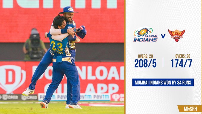 हैदराबादलाई ३४ रनले हराउँदै मुम्बई शीर्ष स्थानमा उक्लियो
