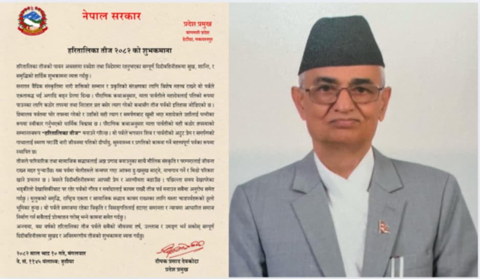 बागमती प्रदेश प्रमुख देवकोटाद्वारा हरितालिका तीजको अवसरमा शुभकामना व्यक्त